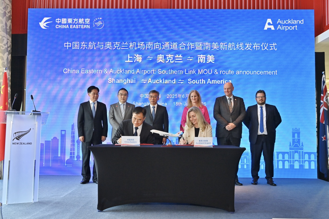 6月18日,中国东航与奥克兰机场在上海签署协议。根据计划,中国东航将于2025年12月开通从上海浦东国际机场出发,经新西兰奥克兰机场中转,飞往阿根廷布宜诺斯艾利斯埃塞萨国际机场的商业航班。新西兰总理克里斯托弗·拉克森(Christopher Luxon)、旅游部长路易丝·阿普斯顿(Louise Upston)、上海市政府副市长张小宏、中国东航董事长王志清,以及上海市交通委、民航华东管理局、上海机场、上海海关、上海出入境边检总站等单位负责人共同出席签约仪式。