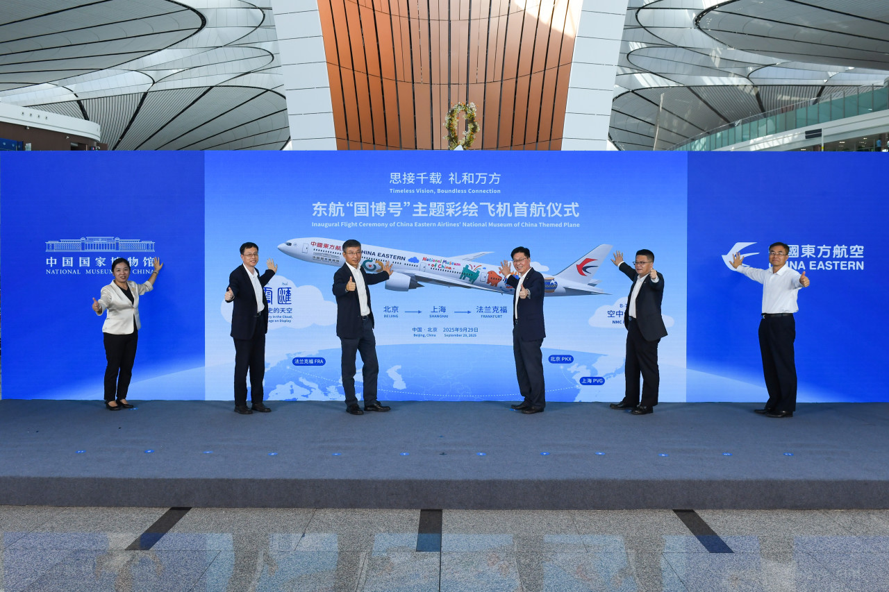 此次“国博号”首航航程与未来的航线规划均承载着深远的文化使命。据悉,在完成9月29日北京大兴至上海浦东的首航后,东航“国博号”主题彩绘机随即飞往德国法兰克福。未来,“国博号”将逐步投入欧美澳等重点长途航线,并积极覆盖共建“一带一路”国家,将中华文明的魅力和文化自信传递到世界更多角落,成为推动文明文化交流互鉴的“空中使者”。