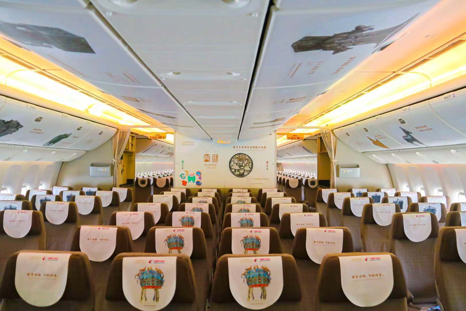 东航“国博号”主题彩绘机被称为是国博48个标准展厅之外的“第49个展厅”。客舱内,近70米长的行李架与舱壁上,按时间顺序贴绘了国博精选的近50件馆藏文物,清晰勾勒出中华文明历史脉络。座椅头枕巾特别设计了凤冠、东坡巾等样式,旅客入座后即可体验“凤冠霞帔”或“羽扇纶巾”的古风意趣,打卡合影,便是一场有温度的文化互动。