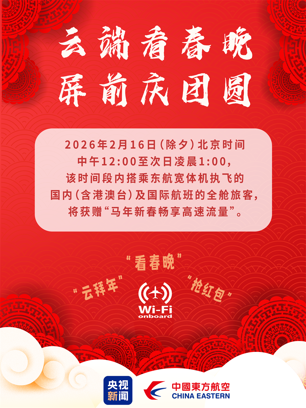 新春佳节来临之际,中国东航宣布,将于除夕(2月16日)12:00起全面升级空中Wi-Fi服务,覆盖东上航所有由宽体机执飞的国内、国际及地区进出港航班,以更普惠、更便捷的云端互联,让万米高空的旅程告别“断网”,实时分享新春年味、同步收看春晚直播,让更多旅客在云端感受美好中国年的喜庆氛围。