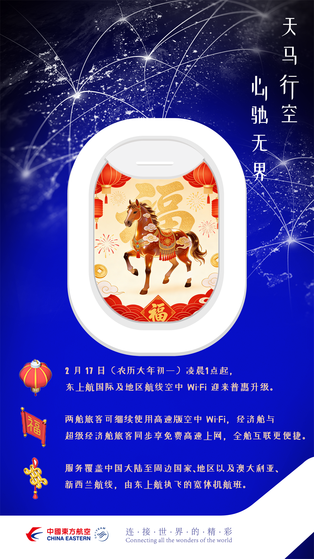 此外,借势新春佳节,东航亦将空中Wi-Fi惠民服务推向更广航线。自2月17日(农历大年初一)01:00起,乘坐东上航实际执飞且由宽体机执飞的中国大陆往返周边国际/地区以及澳大利亚、新西兰航线的旅客,所有舱位(含经济舱、超级经济舱)均可享受免费空中Wi-Fi服务。此前,该服务仅面向两舱旅客提供。此举标志着东航免费空中Wi-Fi正式迈向国际航线,让更漫长的旅途同样充满趣味与联结。